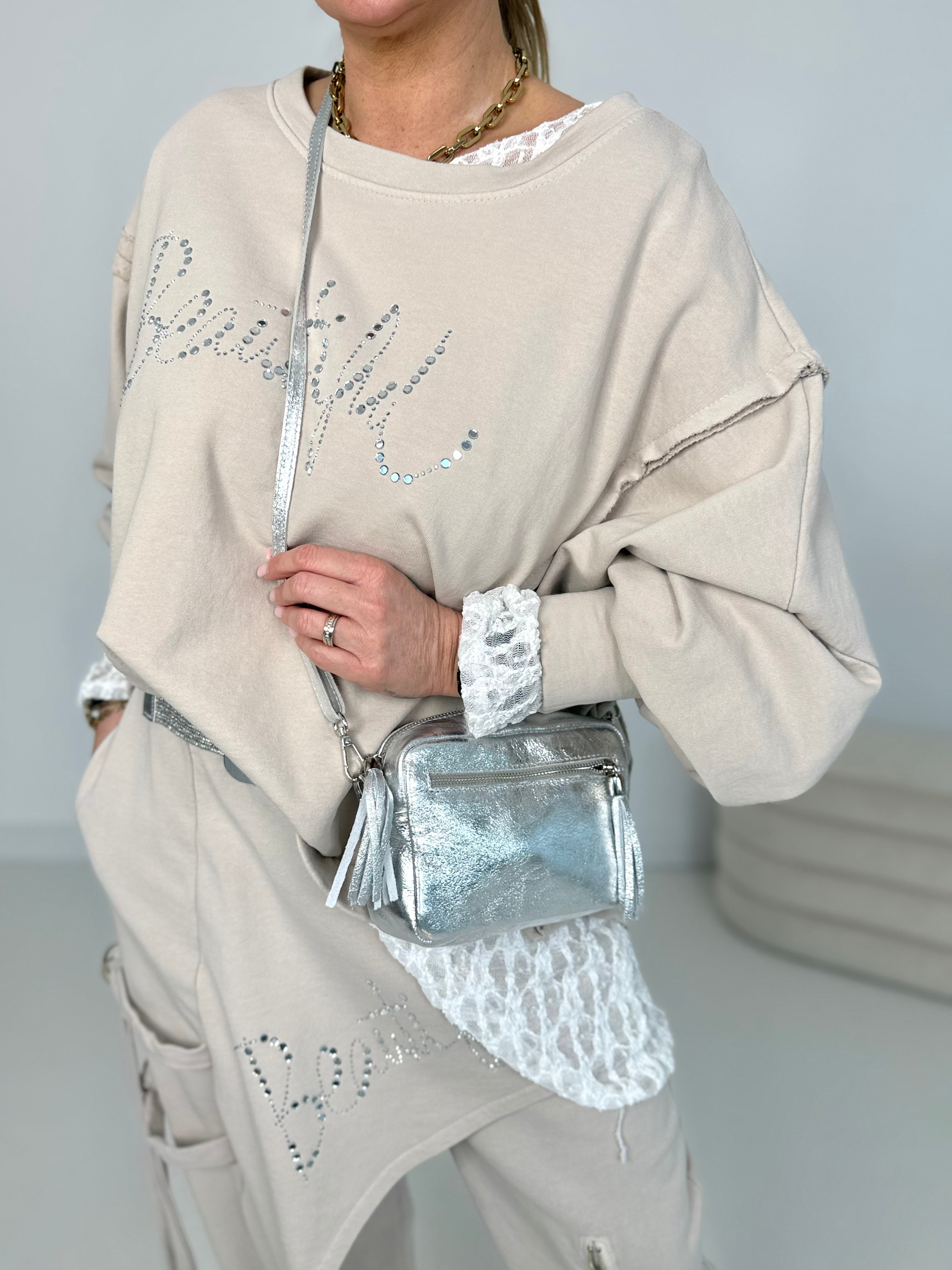 Front lettering with shiny rhinestones